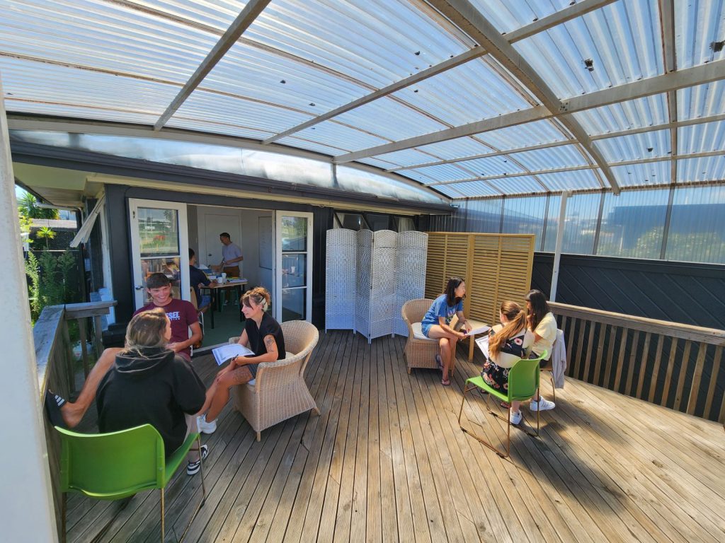 語学学校 Mount Manganui Language Centre は、1990年設立、海から徒歩圏(750M)の最高の立地に校舎を構えており( 左の写真の赤い風船が学校、奥が海です)、大きなガーデンや庭のあり、自然光がたっぷりと入る校舎は、リラックスしつつも、学習に集中できる環境です。